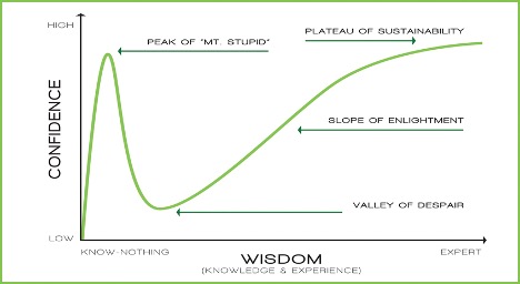 Also, this degree program has been a way for me to reexamine everything that I learned while working in the vast data mines of the Yahoo! Search index. Now I’m moving toward a greater understanding of the data structures necessary for effective information storage, retrieval, and discovery. I’ve thought a lot about the Dunning-Kruger Effect. Here is an amusing version of it from a blog: